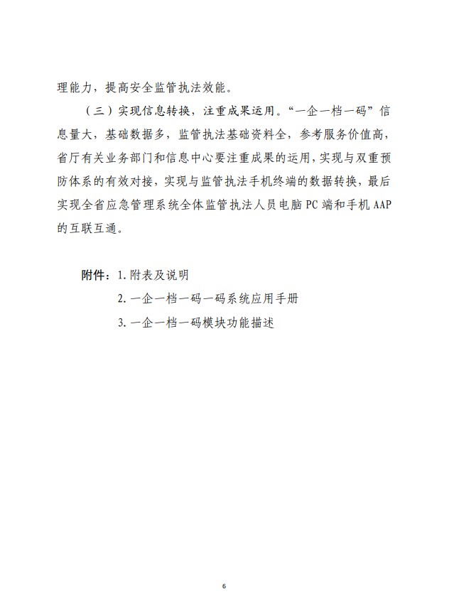安全生產一企一檔一碼信息管理工作,按照分布實施原則,先行對全省煤礦、非煤礦山、危險化學品、工貿行業領域規模以上企業進行普查、等級、注冊、收錄,形成完整齊備的紙質檔案和電子信息檔案,實現紙質檔案和電子信息檔案同時跟進,實現手機執法終端軟件化管理并納入綜合監管平臺,最終為監管執法提供服務。